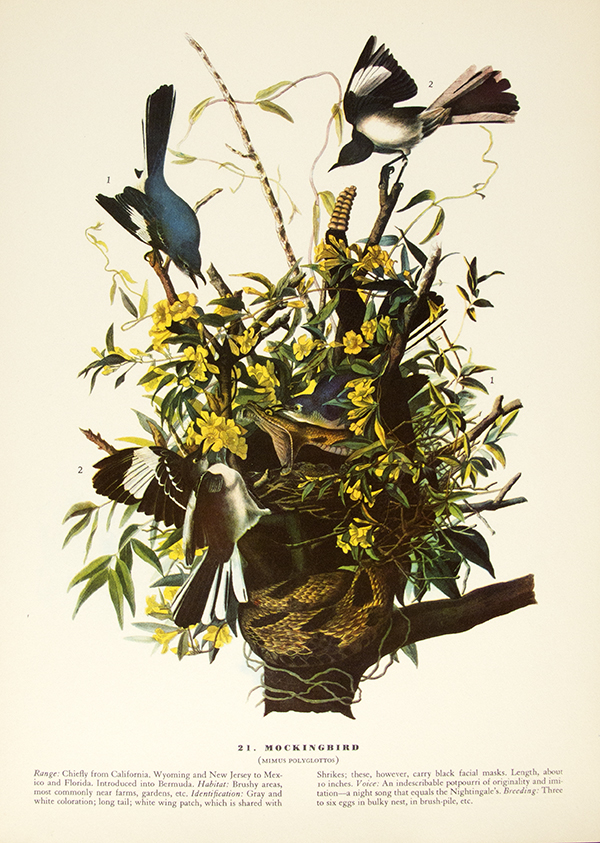 John James Audubon (April 26, 1785 – January 27, 1851) was an ornithologist, artist, naturalist, adventurer, and story teller. Born in San Domingue (now Haiti), Audubon began studying birds, nature, and art after moving to France at the age of five. His studies continued near Philadelphia, when he was sent to a family estate at eighteen. While there, Audubon is said to have conducted the first bird-banding experiment, tying strings to the legs of birds to determine whether they return to the same nesting sites each year. He spent the early 1820s drawing birds in Mississippi, Alabama, Florida, and Louisiana before taking his Birds of America portfolio containing over 400 life-size drawings to England and Scotland for printing. His work was very well received, even gaining a subscriber in King George IV. Audubon’s work was highly praised since it was more natural than previous artists’ renditions. He continued drawing new species for the rest of his life, but later volumes were mostly completed by his sons. As one of the forefathers of the modern conservation and environmentalist movements, many organizations and places bear Audubon’s name. His works are housed in such collections as the National Gallery of Art, Washington, D.C.; the Harvard Library; and the Library of Congress.
