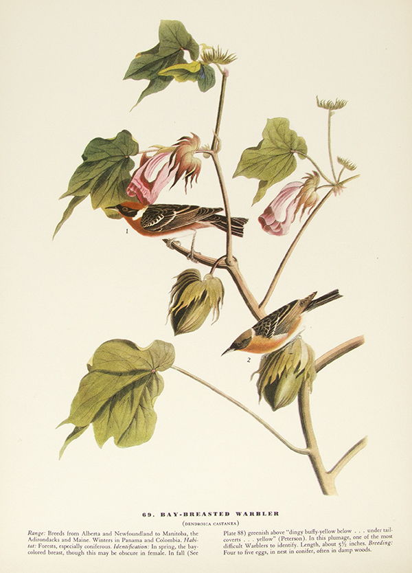 John James Audubon (April 26, 1785 – January 27, 1851) was an ornithologist, artist, naturalist, adventurer, and story teller. Born in San Domingue (now Haiti), Audubon began studying birds, nature, and art after moving to France at the age of five. His studies continued near Philadelphia, when he was sent to a family estate at eighteen. While there, Audubon is said to have conducted the first bird-banding experiment, tying strings to the legs of birds to determine whether they return to the same nesting sites each year. He spent the early 1820s drawing birds in Mississippi, Alabama, Florida, and Louisiana before taking his Birds of America portfolio containing over 400 life-size drawings to England and Scotland for printing. His work was very well received, even gaining a subscriber in King George IV. Audubon’s work was highly praised since it was more natural than previous artists’ renditions. He continued drawing new species for the rest of his life, but later volumes were mostly completed by his sons. As one of the forefathers of the modern conservation and environmentalist movements, many organizations and places bear Audubon’s name. His works are housed in such collections as the National Gallery of Art, Washington, D.C.; the Harvard Library; and the Library of Congress.