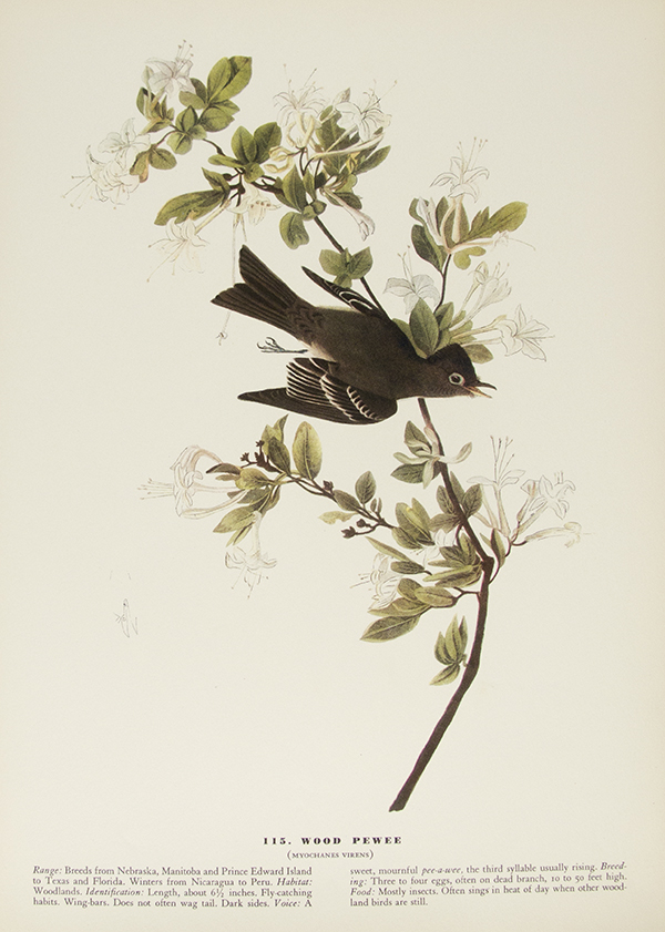 John James Audubon (April 26, 1785 – January 27, 1851) was an ornithologist, artist, naturalist, adventurer, and story teller. Born in San Domingue (now Haiti), Audubon began studying birds, nature, and art after moving to France at the age of five. His studies continued near Philadelphia, when he was sent to a family estate at eighteen. While there, Audubon is said to have conducted the first bird-banding experiment, tying strings to the legs of birds to determine whether they return to the same nesting sites each year. He spent the early 1820s drawing birds in Mississippi, Alabama, Florida, and Louisiana before taking his Birds of America portfolio containing over 400 life-size drawings to England and Scotland for printing. His work was very well received, even gaining a subscriber in King George IV. Audubon’s work was highly praised since it was more natural than previous artists’ renditions. He continued drawing new species for the rest of his life, but later volumes were mostly completed by his sons. As one of the forefathers of the modern conservation and environmentalist movements, many organizations and places bear Audubon’s name. His works are housed in such collections as the National Gallery of Art, Washington, D.C.; the Harvard Library; and the Library of Congress.