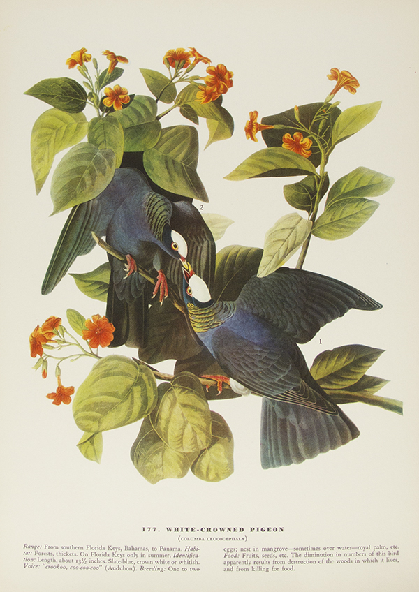John James Audubon (April 26, 1785 – January 27, 1851) was an ornithologist, artist, naturalist, adventurer, and story teller. Born in San Domingue (now Haiti), Audubon began studying birds, nature, and art after moving to France at the age of five. His studies continued near Philadelphia, when he was sent to a family estate at eighteen. While there, Audubon is said to have conducted the first bird-banding experiment, tying strings to the legs of birds to determine whether they return to the same nesting sites each year. He spent the early 1820s drawing birds in Mississippi, Alabama, Florida, and Louisiana before taking his Birds of America portfolio containing over 400 life-size drawings to England and Scotland for printing. His work was very well received, even gaining a subscriber in King George IV. Audubon’s work was highly praised since it was more natural than previous artists’ renditions. He continued drawing new species for the rest of his life, but later volumes were mostly completed by his sons. As one of the forefathers of the modern conservation and environmentalist movements, many organizations and places bear Audubon’s name. His works are housed in such collections as the National Gallery of Art, Washington, D.C.; the Harvard Library; and the Library of Congress.