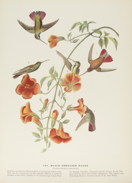 John James Audubon (April 26, 1785 – January 27, 1851) was an ornithologist, artist, naturalist, adventurer, and story teller. Born in San Domingue (now Haiti), Audubon began studying birds, nature, and art after moving to France at the age of five. His studies continued near Philadelphia, when he was sent to a family estate at eighteen. While there, Audubon is said to have conducted the first bird-banding experiment, tying strings to the legs of birds to determine whether they return to the same nesting sites each year. He spent the early 1820s drawing birds in Mississippi, Alabama, Florida, and Louisiana before taking his Birds of America portfolio containing over 400 life-size drawings to England and Scotland for printing. His work was very well received, even gaining a subscriber in King George IV. Audubon’s work was highly praised since it was more natural than previous artists’ renditions. He continued drawing new species for the rest of his life, but later volumes were mostly completed by his sons. As one of the forefathers of the modern conservation and environmentalist movements, many organizations and places bear Audubon’s name. His works are housed in such collections as the National Gallery of Art, Washington, D.C.; the Harvard Library; and the Library of Congress.
