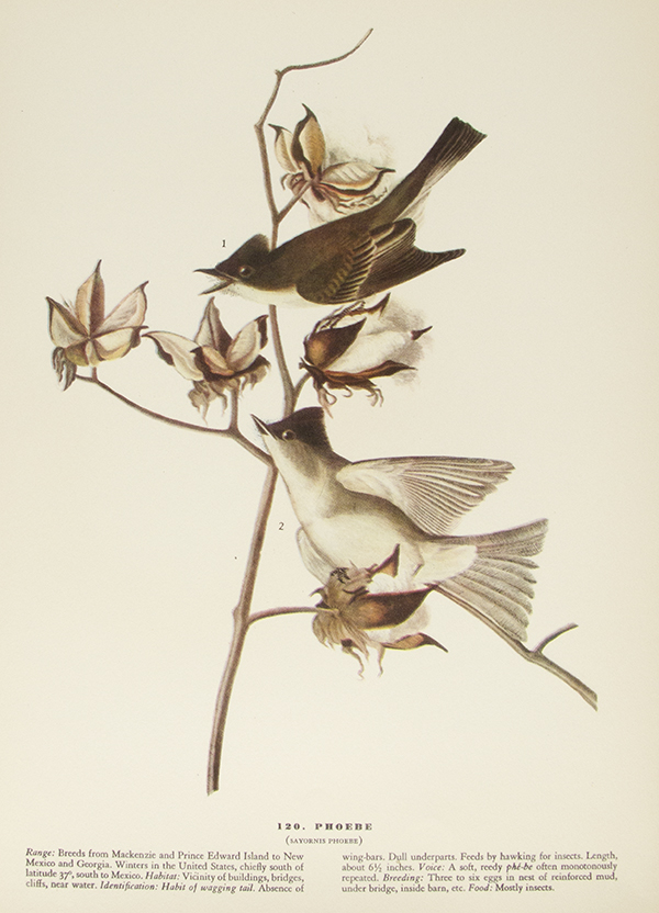John James Audubon (April 26, 1785 – January 27, 1851) was an ornithologist, artist, naturalist, adventurer, and story teller. Born in San Domingue (now Haiti), Audubon began studying birds, nature, and art after moving to France at the age of five. His studies continued near Philadelphia, when he was sent to a family estate at eighteen. While there, Audubon is said to have conducted the first bird-banding experiment, tying strings to the legs of birds to determine whether they return to the same nesting sites each year. He spent the early 1820s drawing birds in Mississippi, Alabama, Florida, and Louisiana before taking his Birds of America portfolio containing over 400 life-size drawings to England and Scotland for printing. His work was very well received, even gaining a subscriber in King George IV. Audubon’s work was highly praised since it was more natural than previous artists’ renditions. He continued drawing new species for the rest of his life, but later volumes were mostly completed by his sons. As one of the forefathers of the modern conservation and environmentalist movements, many organizations and places bear Audubon’s name. His works are housed in such collections as the National Gallery of Art, Washington, D.C.; the Harvard Library; and the Library of Congress.