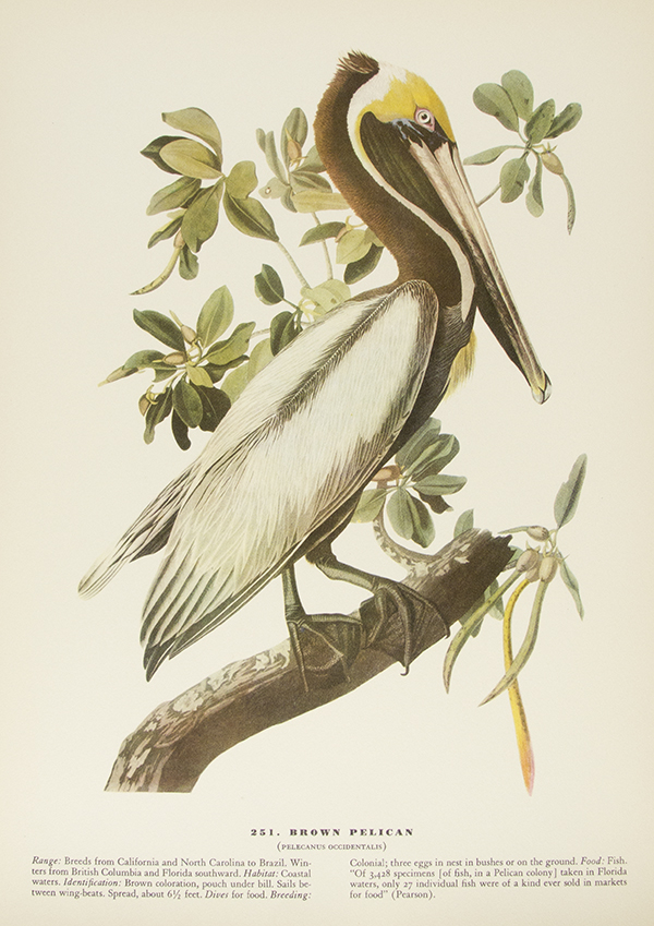 John James Audubon (April 26, 1785 – January 27, 1851) was an ornithologist, artist, naturalist, adventurer, and story teller. Born in San Domingue (now Haiti), Audubon began studying birds, nature, and art after moving to France at the age of five. His studies continued near Philadelphia, when he was sent to a family estate at eighteen. While there, Audubon is said to have conducted the first bird-banding experiment, tying strings to the legs of birds to determine whether they return to the same nesting sites each year. He spent the early 1820s drawing birds in Mississippi, Alabama, Florida, and Louisiana before taking his Birds of America portfolio containing over 400 life-size drawings to England and Scotland for printing. His work was very well received, even gaining a subscriber in King George IV. Audubon’s work was highly praised since it was more natural than previous artists’ renditions. He continued drawing new species for the rest of his life, but later volumes were mostly completed by his sons. As one of the forefathers of the modern conservation and environmentalist movements, many organizations and places bear Audubon’s name. His works are housed in such collections as the National Gallery of Art, Washington, D.C.; the Harvard Library; and the Library of Congress.