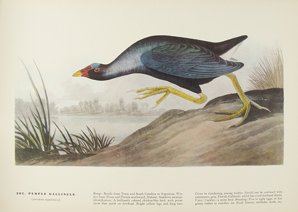 John James Audubon (April 26, 1785 – January 27, 1851) was an ornithologist, artist, naturalist, adventurer, and story teller. Born in San Domingue (now Haiti), Audubon began studying birds, nature, and art after moving to France at the age of five. His studies continued near Philadelphia, when he was sent to a family estate at eighteen. While there, Audubon is said to have conducted the first bird-banding experiment, tying strings to the legs of birds to determine whether they return to the same nesting sites each year. He spent the early 1820s drawing birds in Mississippi, Alabama, Florida, and Louisiana before taking his Birds of America portfolio containing over 400 life-size drawings to England and Scotland for printing. His work was very well received, even gaining a subscriber in King George IV. Audubon’s work was highly praised since it was more natural than previous artists’ renditions. He continued drawing new species for the rest of his life, but later volumes were mostly completed by his sons. As one of the forefathers of the modern conservation and environmentalist movements, many organizations and places bear Audubon’s name. His works are housed in such collections as the National Gallery of Art, Washington, D.C.; the Harvard Library; and the Library of Congress.