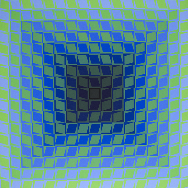 Victor Vasarely (April 9, 1906 – March 15, 1997) was a French-Hungarian artist known as the “grandfather” and leader of the Optical Art movement. Vasarely used geometric shapes and color graphics to create illusions of spatial depth. Born in Hungary, Vasarely briefly studied medicine for two years prior to attending the Muhely Academy, the center of the Bauhaus movement in Germany. He also studied traditional painting at the private Podolini-Volkmann Academy. In 1930, Vasarely settled in Paris, where he married fellow art student Claire Spinner. Throughout the 1940s, Vasarely experimented with style until he found his signature style in 1951, which was a combination of science and art. Vasarely’s artistic formula draws parallels with modern computer programming and computer art. Contributing to his legacy, Vasarely established and donated works to the Vasarely Museum in his hometown of Pécs, Hungary. Other museums have also been opened in his honor. Vasarely’s work is held in collections such as the Art Institute of Chicago, the Tate Gallery in London, and the Peggy Guggenheim Collection in Venice.