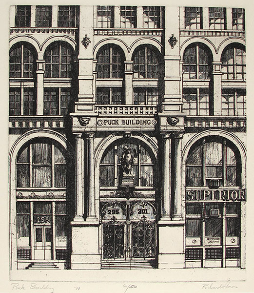 Richard Haas (August 29, 1936) is best known for his use of the trompe l’oeil technique to create illusionistic murals representing architectural features in three dimensions. Born in Spring Greene, Wisconsin, Haas earned his BS from the University of Wisconsin, Milwaukee in 1959, then his MFA from the University of Minnesota. Relatively early in life, Haas assisted his uncle as a stonemason, allowing Haas to view the work of architect Frank Lloyd Wright, which greatly influenced his artistic style. In 1975, Haas completed his first outdoor mural. Since then, he has painted hundreds of murals across the country and continues to travel, painting commissioned murals. Haas has received commendations including a Guggenheim Fellowship (1983) and the Westchester Arts Council Artist Award (2003). Aside from his many public artworks, Haas’ works are also held in collections such as the Museum of Modern Art, New York; the Museum of Fine Arts, Boston; and the Milwaukee Art Museum.