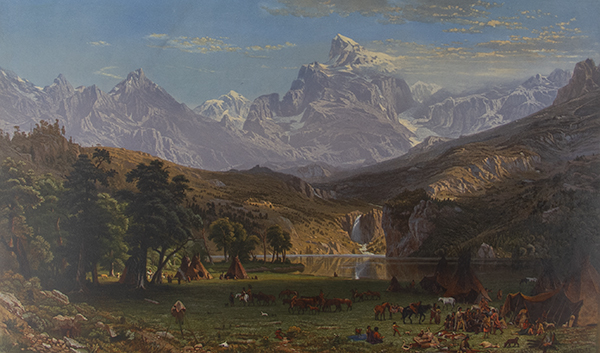Albert Bierstadt (January 7, 1830 – February 18, 1902), known for his large-scale romanticized landscapes of the American West, was born in Germany but immigrated to Massachusetts shortly afterward. Largely self-taught, Bierstadt attended an informal art school in Dusseldorf, Germany, to refine his technical skills. While in Europe, Bierstadt painted Alpine landscapes. When he returned to America, Bierstadt worked on survey expeditions throughout the 1860s and 1870s, travelling across the West and Canada. He took photos and made field sketches as references which he used while painting in his New York studio. His paintings were popular in Europe, even garnering attention from Queen Victoria in 1867 and prompting immigration to the US; however, Bierstadt’s paintings were also criticized as overly dramatic with their bright lighting. Thus, his work fell out of style until it was rediscovered in the 1960s. Over his career, Bierstadt painted over 500 works, which are now held in collections such as the National Gallery of Art in Washington, D.C.; the Metropolitan Museum of Art, New York; and the Timken Museum of Art, San Diego.