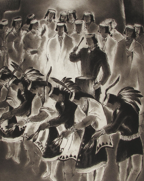 Gene Kloss (July 27, 1903 – June 24, 1996), an artist from Oakland, California, is best known for her prints depicting the Western landscape and ceremonies of the Pueblo people, which she observed in her many years living in Taos, New Mexico. Kloss studied at the University of California, Berkley under Ray Boynton and Perham Nahl. After graduation, she spent two years at the California School of Fine Arts. During the Great Depression, Kloss worked creating watercolors and oil paintings for the Works Progress Administration and as an etcher for the Public Works of Art Project. Kloss’ commendations include her position as an Academician of the National Academy of Design. Her works are held in collections such as the Library of Congress, the San Francisco Art Museum, and the Carnegie Institute, Michigan.