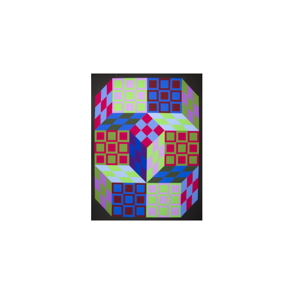 Victor Vasarely (April 9, 1906 – March 15, 1997) was a French-Hungarian artist known as the “grandfather” and leader of the Optical Art movement. Vasarely used geometric shapes and color graphics to create illusions of spatial depth. Born in Hungary, Vasarely briefly studied medicine for two years prior to attending the Muhely Academy, the center of the Bauhaus movement in Germany. He also studied traditional painting at the private Podolini-Volkmann Academy. In 1930, Vasarely settled in Paris, where he married fellow art student Claire Spinner. Throughout the 1940s, Vasarely experimented with style until he found his signature style in 1951, which was a combination of science and art. Vasarely’s artistic formula draws parallels with modern computer programming and computer art. Contributing to his legacy, Vasarely established and donated works to the Vasarely Museum in his hometown of Pécs, Hungary. Other museums have also been opened in his honor. Vasarely’s work is held in collections such as the Art Institute of Chicago, the Tate Gallery in London, and the Peggy Guggenheim Collection in Venice.