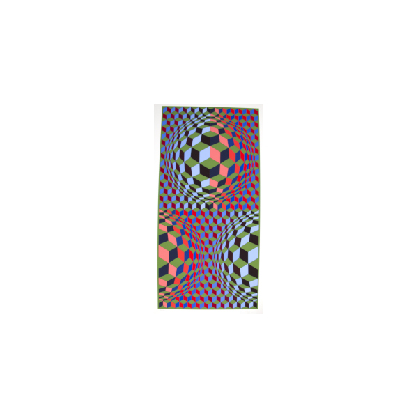 Victor Vasarely (April 9, 1906 – March 15, 1997) was a French-Hungarian artist known as the “grandfather” and leader of the Optical Art movement. Vasarely used geometric shapes and color graphics to create illusions of spatial depth. Born in Hungary, Vasarely briefly studied medicine for two years prior to attending the Muhely Academy, the center of the Bauhaus movement in Germany. He also studied traditional painting at the private Podolini-Volkmann Academy. In 1930, Vasarely settled in Paris, where he married fellow art student Claire Spinner. Throughout the 1940s, Vasarely experimented with style until he found his signature style in 1951, which was a combination of science and art. Vasarely’s artistic formula draws parallels with modern computer programming and computer art. Contributing to his legacy, Vasarely established and donated works to the Vasarely Museum in his hometown of Pécs, Hungary. Other museums have also been opened in his honor. Vasarely’s work is held in collections such as the Art Institute of Chicago, the Tate Gallery in London, and the Peggy Guggenheim Collection in Venice.
