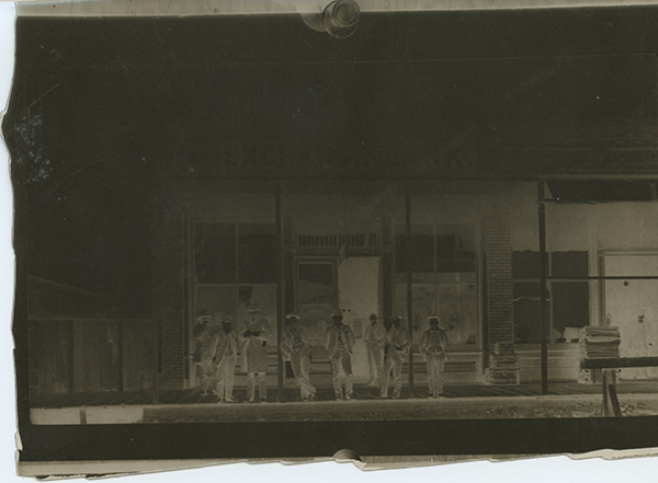 Exterior Exchange Bank, Ohio between 6th and 7th, in picture: Mr. Israel, owner of the bank, Joe Mctarland, Henry Stanley, and Mr. Archibald, manager of the bank