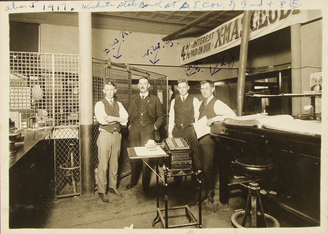 Interior Wichita State Bank, SE corner 8th and Indiana, left to right: J.W. Korrenbrock, W.W. Gardner, Walter Sisk, Lester Jones