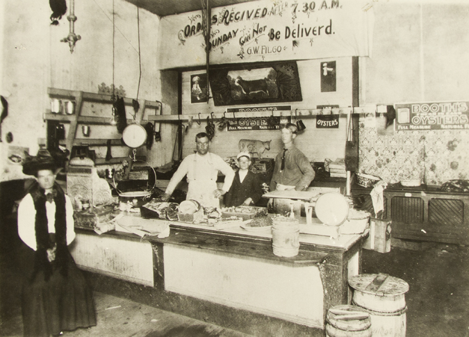 Interior Filgo Market, Fritz Hendricj is the attendant behind the counter, business next to where First National Bank was in 1957