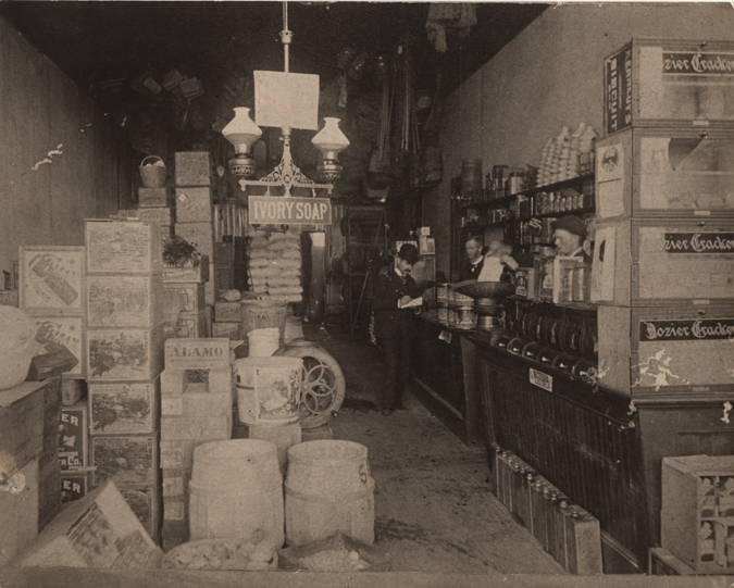 Interior O.W. Bean and Son Grocery Store. O.W. Bean and B.J. Bean behind counter.