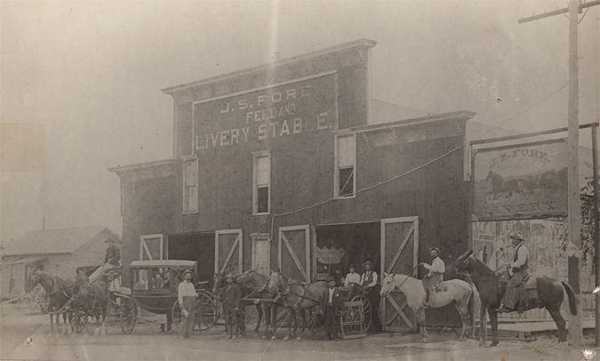 Exterior J.S. Fore Feed and Livery Stable at corner of 7th and Scott