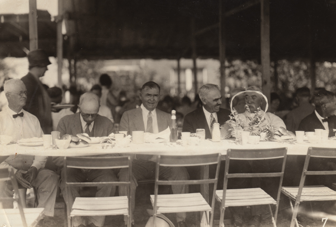 Men seated at table at Marlow-Carrigan Old Settlers Reunion. Left to right: F.M. Power, Judge P.A. Martin, T.J. Waggoner, Hi Willis, M. Bandy, and Will Clapp.