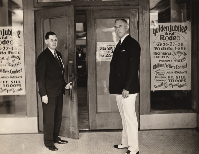 W.D. Cline (chairman of the Golden Jubilee) and Lester Jones (chairman of the Historical Exhibits Committee) of the Golden Jubilee opening of the exhibits hall on 8th Street to the public.