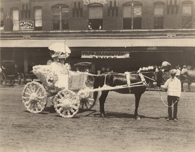 Flower decorated buggy, July 4, Miss. Sadie Kell and Ms. T.W. Roberts in buggy.