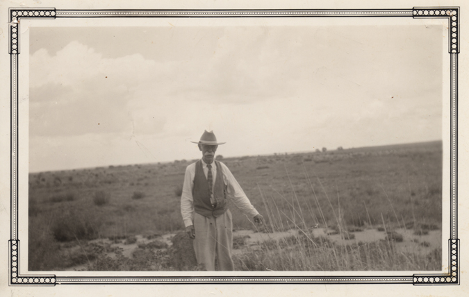 Mr. Charlie Foor pointing to spot where Billy the Kid fell when shot by Sheriff Pat Garrett.