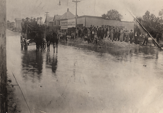 Men, women, wagon, boy with bicycle, corner of 10th and Scott in high water