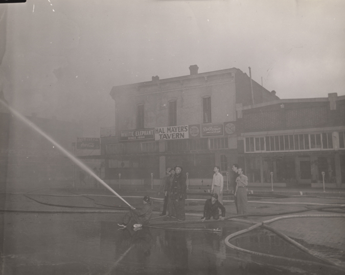 Firemen with spectators. Hal Mayer's Tavern in background.