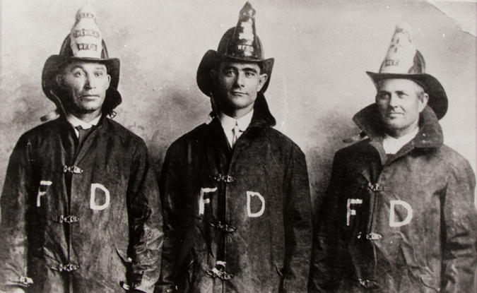Three firemen, from left to right Adam Cokan, A. K. Collins, and J. L. McClure(?)