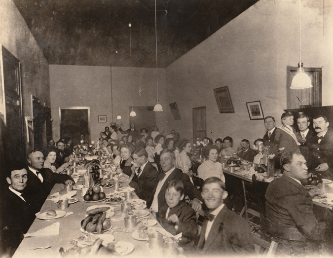 Banquet with Wichita Falls Fire Depatment October 6, 1911. Among those present are J. T. Young, V. E. Stompfli, J. H. Roberts, Grone Hoberu, and E. B. McHam