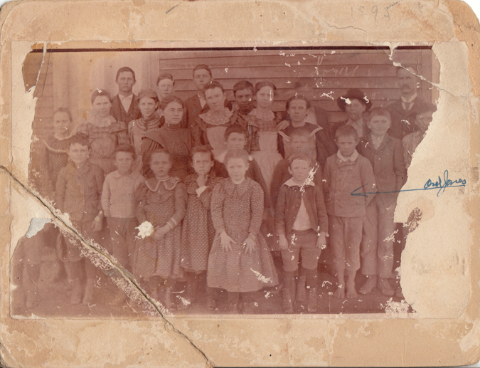 School class, Holiday school about 1897, with professor J. H. Oglesby, Oral Jones, Harry and Jennie Roberson, Grover Davis, Lula and Bertha Taylor, Edgar, Herbert and Mamie Perkins, George and Maud Carnes