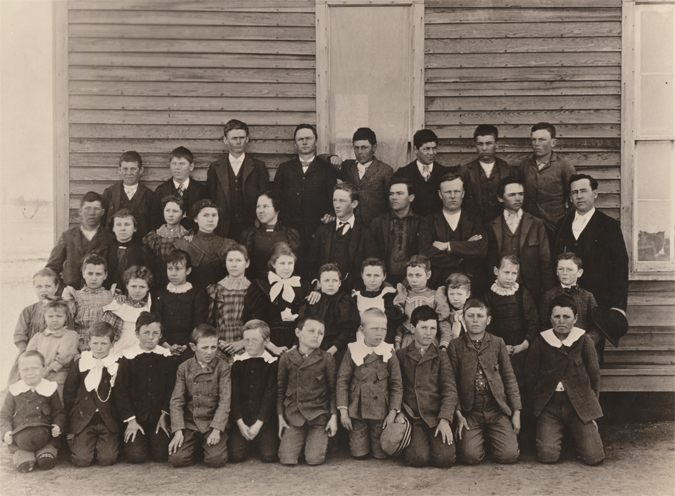 Holiday school with students pictured, teacher is Professor Rinehart, among the student are Oral Jones, Clyde and Jennie and Harry Roberson, Grover Davis, Bertha and Lula Taylor, Herbert and Velma ad Mamie Perkins, George and Ora and Maud Carnes, Herbert and Leland George, Ed and Charlie Ford