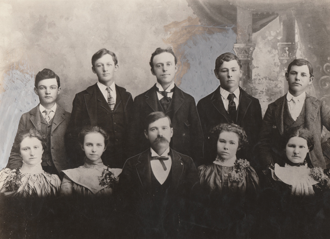 Wichita Falls High School, graduating class of 1900; lower row from left to right Lillis Cook, Emma Simmons, Professor W. F. Jourdan, Nina Beou, Virgil Withers; Upper row left to right George brothers, Altus Pemer, Professor Souder, john Robertson, Jim Dean