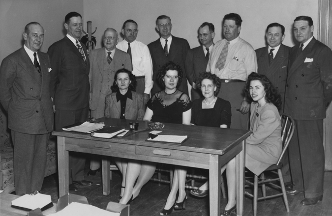 Photo of the three Wichita County draft boards. Left to right; J. M. Williams, Ernest Birk, Iowa Park, major Perkins, Starnes, homer Lee, Fred Elbert, T. Leo moore of Electra, J. L. Jackson, Jr, J.H.S. Bonner. Seated four clerks; Misses Mary Ward, Frances Bryant, Flora Lane, and Mrs. betty Hayes.