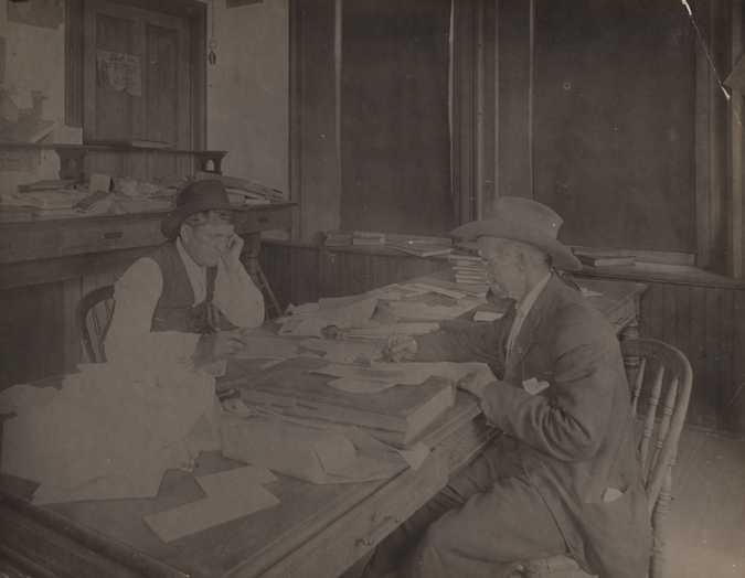 Two men at desk. Left to right; W.J. Bullock and W.J. Howard (Justice of the Peace). Picture taken in Old Court House.