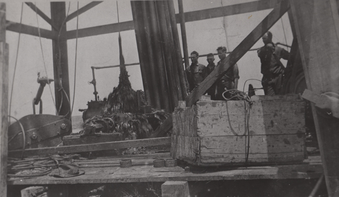 Four men watching an oil gusher. First Fowler well at Burkburnett which came in July 1918 and started the Burkburnett Oil Boom. The man at the right handling the broke is B.F. Van Pelt.
