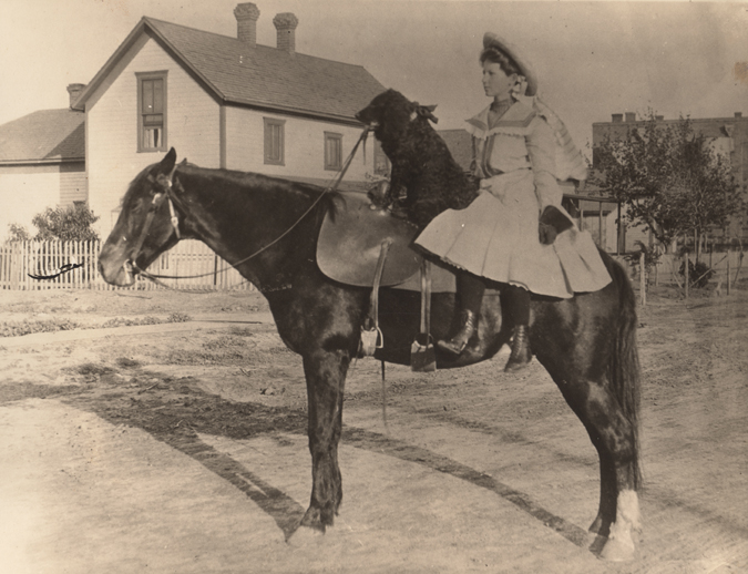 Girl on horse with dog, sidesaddle