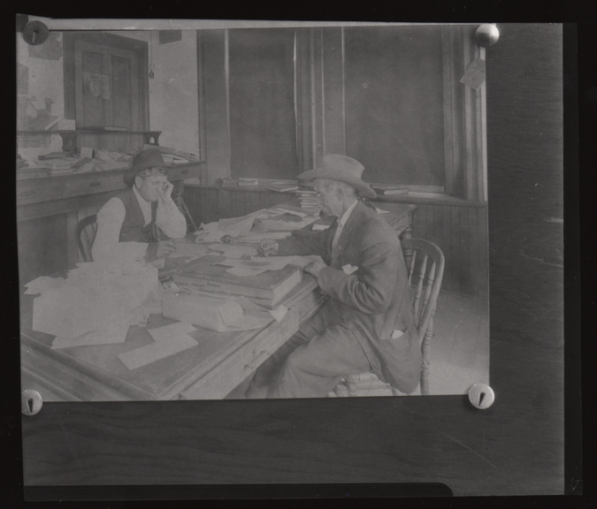 Two men working on papers at table