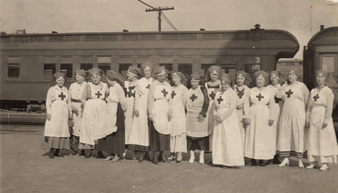 World War I Red Cross volunteers serving refreshments to troops at the union station. Included in the photo are Mrs. Willie MayKell, Mrs. P.P. Langford, Mrs. Newton Maer, mrs. G.D. Anderson, Mrs. Marchman, Mrs. Atkinson, Mrs. Jim Montgomery, Mrs. o.E. Maer, Mrs. Beavers, Mrs. J.A. Kemp, and Mrs. Burnsides.