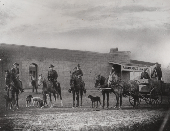 Foster Brothers King County horse ranch trail outfit in 1886. This picture was taken in front of Panhandle Bank (now the First national bank) at the corner of 7th and Indiana.