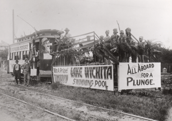 "All aboard for a plunge", children in bathing suits, Lake Wichita swimming pool