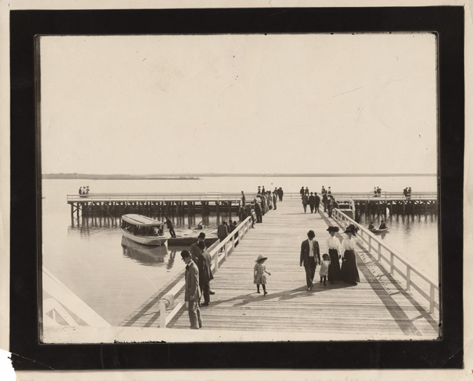 Lake Wichita Pavilion with boardwalk, people and boats. People on boardwalk identified by SiByl Cahoon as; little girl SiByl Cahoon, Joseph Kemp, little boy Joseph Anderson Kemp, and Flora Anderson Kemp.