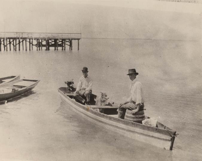 Two men in boat with dog around Lake Wichita Pavillion, Cy Bates