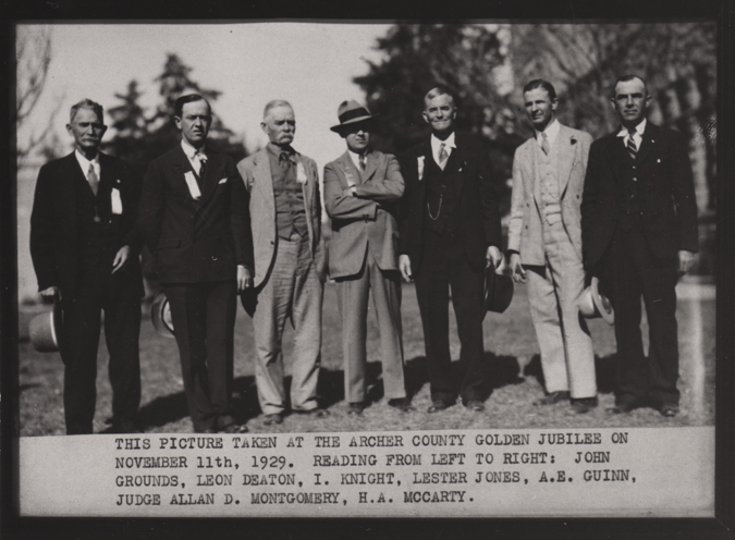 Archer County Golden Jubilee on November 11, 1929. From left to right: John Grounds, Leon Deaton, I. Knight, Lester Jones, A. E. Guinn, Judge Allen D. Montgomery, and H. A. McCarty.