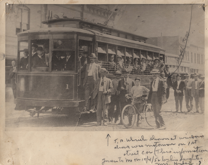 Wichita Falls first street car run. Among those in the picture are Ed Howard, Frank Kell, J.R.J Orth, and J.B. Stokes.