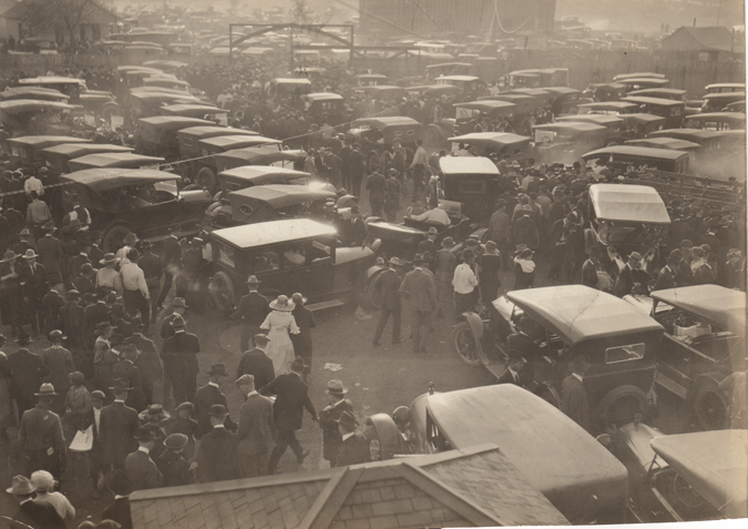 Crowd of people and cars in parking lot, 1st Spudders game