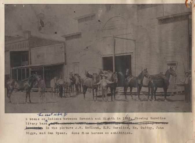 Gorsline Livery Barn on Indiana between Seventh and Eighth Street. In picture J.W. McCloud, E.B. Gorsline, Mr. Guffey, John Diggs, and Sam Spear.