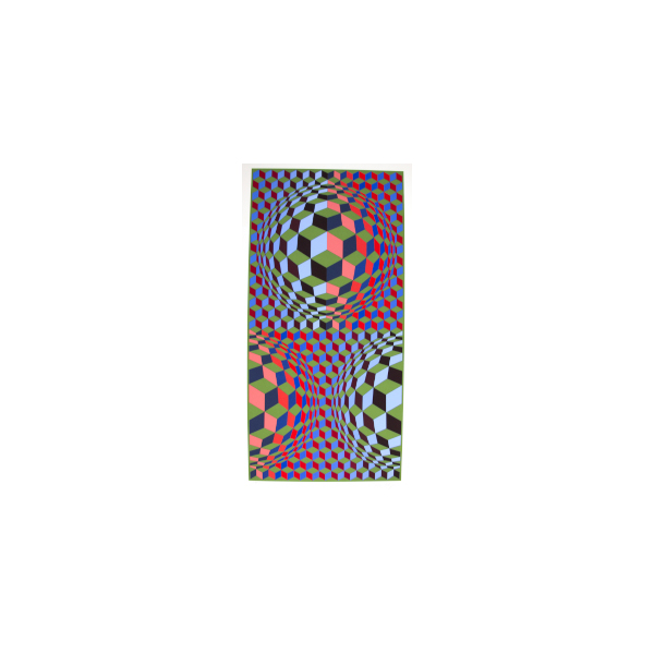 Victor Vasarely (April 9, 1906 – March 15, 1997) was a French-Hungarian artist known as the “grandfather” and leader of the Optical Art movement. Vasarely used geometric shapes and color graphics to create illusions of spatial depth. Born in Hungary, Vasarely briefly studied medicine for two years prior to attending the Muhely Academy, the center of the Bauhaus movement in Germany. He also studied traditional painting at the private Podolini-Volkmann Academy. In 1930, Vasarely settled in Paris, where he married fellow art student Claire Spinner. Throughout the 1940s, Vasarely experimented with style until he found his signature style in 1951, which was a combination of science and art. Vasarely’s artistic formula draws parallels with modern computer programming and computer art. Contributing to his legacy, Vasarely established and donated works to the Vasarely Museum in his hometown of Pécs, Hungary. Other museums have also been opened in his honor. Vasarely’s work is held in collections such as the Art Institute of Chicago, the Tate Gallery in London, and the Peggy Guggenheim Collection in Venice.