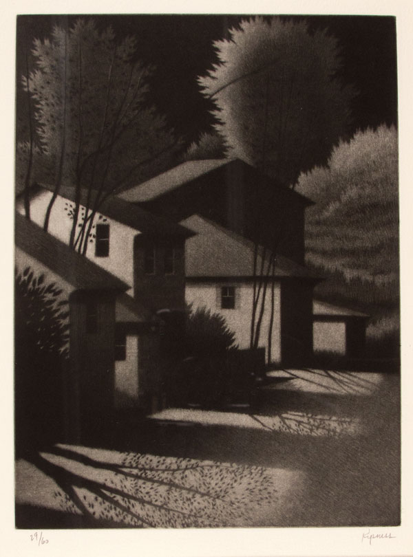 Robert Kipniss (1931) is a painter and printmaker from New York whose work – usually lithographs and mezzotints – typically depicts trees, houses, and still lifes set against landscapes with a characteristic sense of solitude. Kipniss was born into an artistic family – both of his parents were commercial illustrators. At age sixteen, Kipniss began attending the New York’s Art Students League on Saturdays. In 1954, he earned his BA and his MFA in English literature from the University of Iowa. He was then drafted into the US army for two years, where he drew training aids. After his discharge, he painted during the day while working at the Manhattan General Post Office in the evenings until 1964. Kipniss has received commendations including two honorary doctorates and the Benjamin Clinedest Memorial Medal for lifetime achievement in art (2010). His work is held in collections such as the Art Students League in New York; the Carnegie Museum of Art, Pennsylvania; and the Museum of Fine Arts, Boston.
