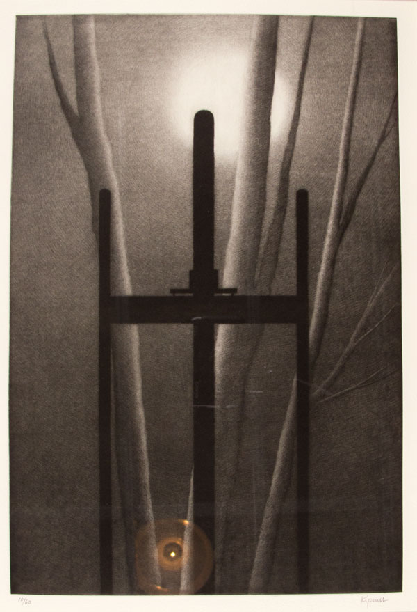 Robert Kipniss (1931) is a painter and printmaker from New York whose work – usually lithographs and mezzotints – typically depicts trees, houses, and still lifes set against landscapes with a characteristic sense of solitude. Kipniss was born into an artistic family – both of his parents were commercial illustrators. At age sixteen, Kipniss began attending the New York’s Art Students League on Saturdays. In 1954, he earned his BA and his MFA in English literature from the University of Iowa. He was then drafted into the US army for two years, where he drew training aids. After his discharge, he painted during the day while working at the Manhattan General Post Office in the evenings until 1964. Kipniss has received commendations including two honorary doctorates and the Benjamin Clinedest Memorial Medal for lifetime achievement in art (2010). His work is held in collections such as the Art Students League in New York; the Carnegie Museum of Art, Pennsylvania; and the Museum of Fine Arts, Boston.
