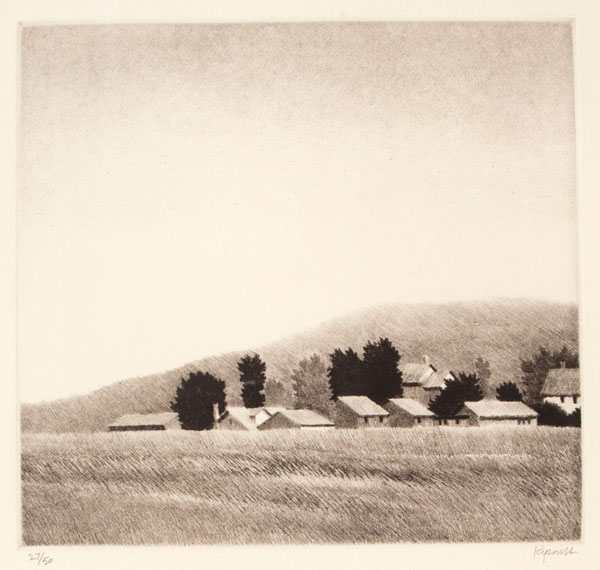Robert Kipniss (1931) is a painter and printmaker from New York whose work – usually lithographs and mezzotints – typically depicts trees, houses, and still lifes set against landscapes with a characteristic sense of solitude. Kipniss was born into an artistic family – both of his parents were commercial illustrators. At age sixteen, Kipniss began attending the New York’s Art Students League on Saturdays. In 1954, he earned his BA and his MFA in English literature from the University of Iowa. He was then drafted into the US army for two years, where he drew training aids. After his discharge, he painted during the day while working at the Manhattan General Post Office in the evenings until 1964. Kipniss has received commendations including two honorary doctorates and the Benjamin Clinedest Memorial Medal for lifetime achievement in art (2010). His work is held in collections such as the Art Students League in New York; the Carnegie Museum of Art, Pennsylvania; and the Museum of Fine Arts, Boston.