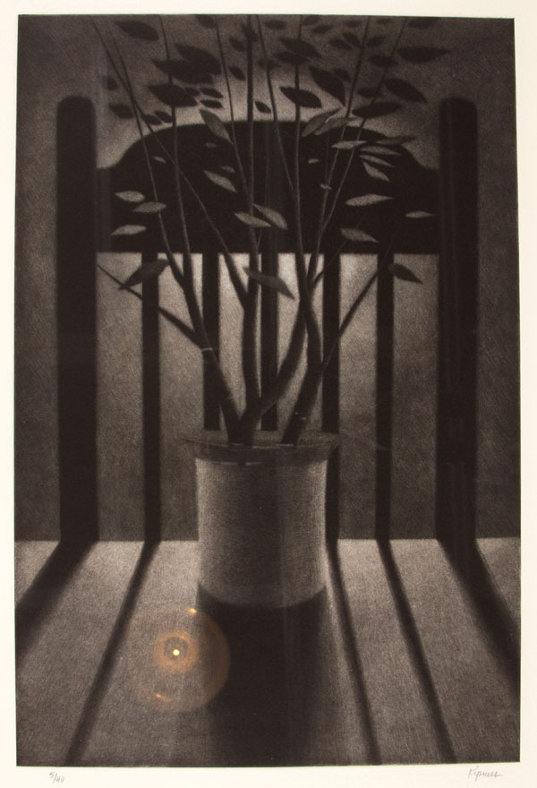Robert Kipniss (1931) is a painter and printmaker from New York whose work – usually lithographs and mezzotints – typically depicts trees, houses, and still lifes set against landscapes with a characteristic sense of solitude. Kipniss was born into an artistic family – both of his parents were commercial illustrators. At age sixteen, Kipniss began attending the New York’s Art Students League on Saturdays. In 1954, he earned his BA and his MFA in English literature from the University of Iowa. He was then drafted into the US army for two years, where he drew training aids. After his discharge, he painted during the day while working at the Manhattan General Post Office in the evenings until 1964. Kipniss has received commendations including two honorary doctorates and the Benjamin Clinedest Memorial Medal for lifetime achievement in art (2010). His work is held in collections such as the Art Students League in New York; the Carnegie Museum of Art, Pennsylvania; and the Museum of Fine Arts, Boston.