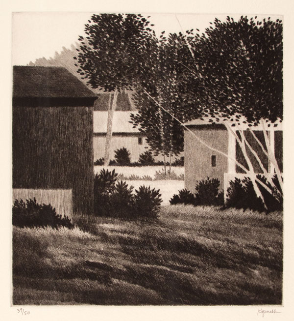 Robert Kipniss (1931) is a painter and printmaker from New York whose work – usually lithographs and mezzotints – typically depicts trees, houses, and still lifes set against landscapes with a characteristic sense of solitude. Kipniss was born into an artistic family – both of his parents were commercial illustrators. At age sixteen, Kipniss began attending the New York’s Art Students League on Saturdays. In 1954, he earned his BA and his MFA in English literature from the University of Iowa. He was then drafted into the US army for two years, where he drew training aids. After his discharge, he painted during the day while working at the Manhattan General Post Office in the evenings until 1964. Kipniss has received commendations including two honorary doctorates and the Benjamin Clinedest Memorial Medal for lifetime achievement in art (2010). His work is held in collections such as the Art Students League in New York; the Carnegie Museum of Art, Pennsylvania; and the Museum of Fine Arts, Boston.